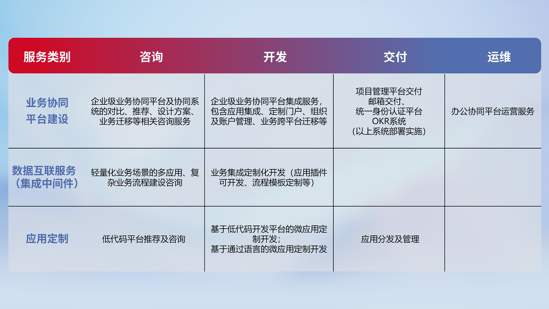 针对钉钉、、、企微、、IDaas等平台级产品提供产品的规划、、、方案、、、交付、、、定制化开发等服务,,,实现如统一协同办公、、、智能客户服务、、混合会议管理、、、、智能数据查询、、、、等业务场景,,实现数字化转型。。。